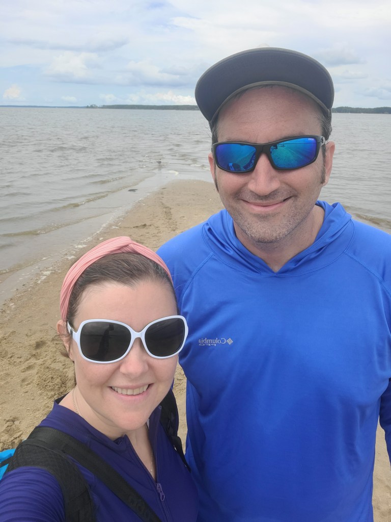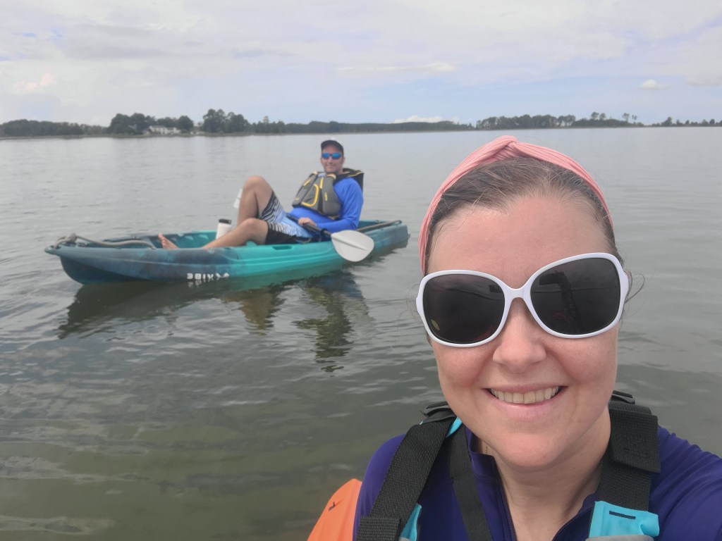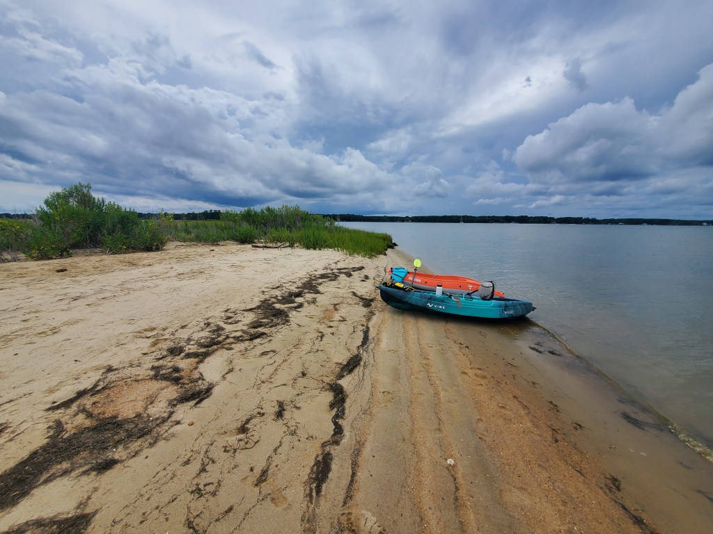 For this stop, the Ware River was perfect for us. After arriving late Saturday afternoon, we enjoyed Trader Joe’s burritos for dinner in the cockpit and later sat out on deck watching the stars. It’s amazing what you can see without light pollution! Sunday afternoon we kayaked over to Windmill Point, which has a little sandy spit and beach that backs up to marsh. It was partly cloudy, but Paul launched the drone and got footage of the surrounding area that we hope to incorporate into a video for our YouTube channel. While he flew the drone, I scoured the beach for ‘treasures.’ I didn’t find any arrow heads or shark teeth, but I did find bits of old pottery. I left the pieces behind in an old tree stump on the beach – if you happen to find them, let us know!