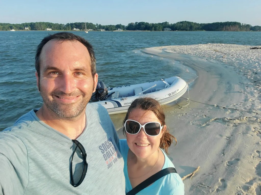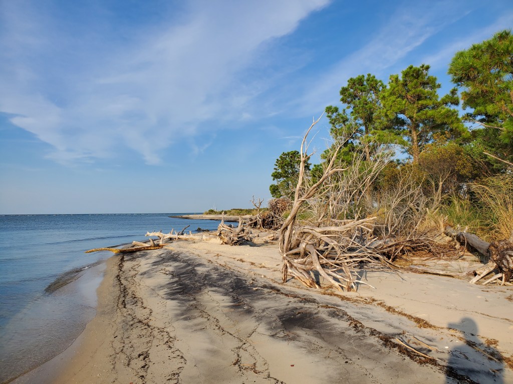 Little Bay’s close proximity to Deltaville and distance from our home port make this destination not just an easy stop on any cruise north up the Chesapeake Bay, but is close enough that we could make this an outing for any holiday weekend we want to get away and spend time in nature. Our first night in Little Bay, we took the dinghy out toward the marshes past Oyster Creek. We noticed several skinny white markers in the waterway that marked the shallow channel and it seemed several locals passing through on small fishing boats knew how to navigate through the marsh, but we wouldn’t attempt this on one of those boats without local knowledge. We bumped the sea floor with our dinghy in the middle of the waterway and decided our best bet would be to kayak through here instead. So, we turned the dinghy around and headed for “Pirate’s Beach.” On the southern end, a wooden shack was erected with a roof. We noticed cruisers congregating here on the beach at sunset, which makes sense – the sunset views were pretty incredible.