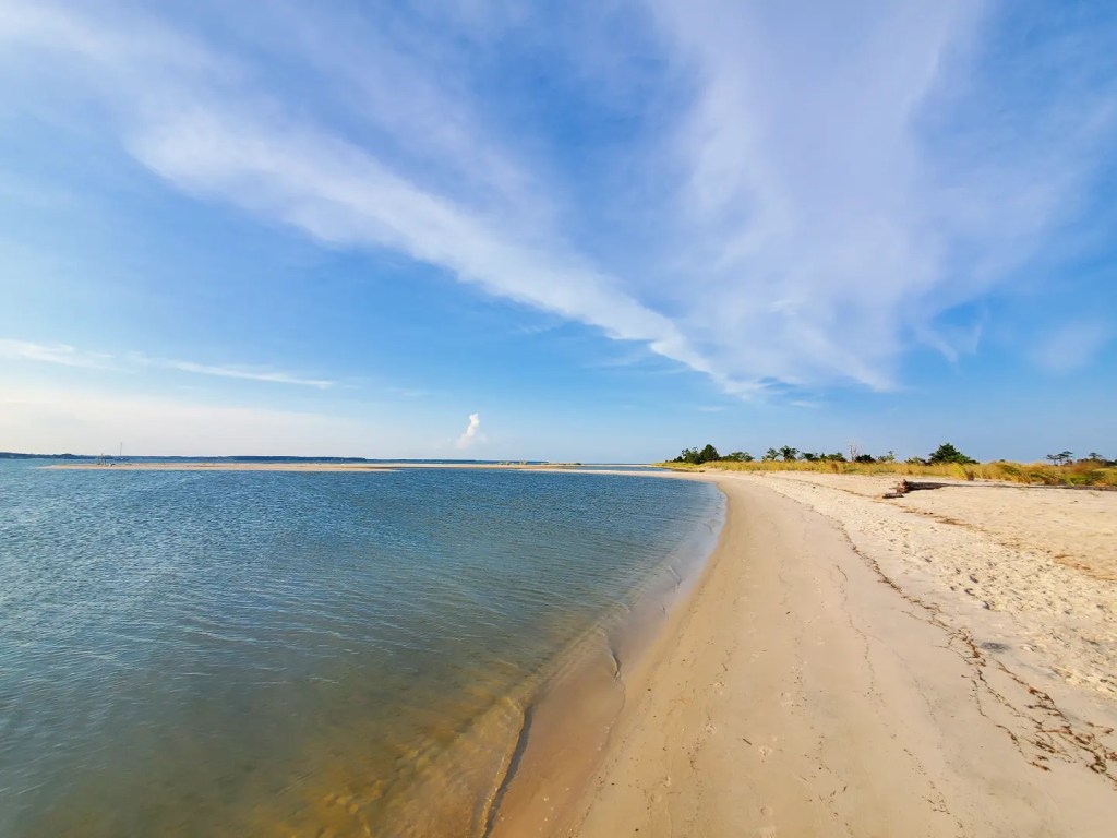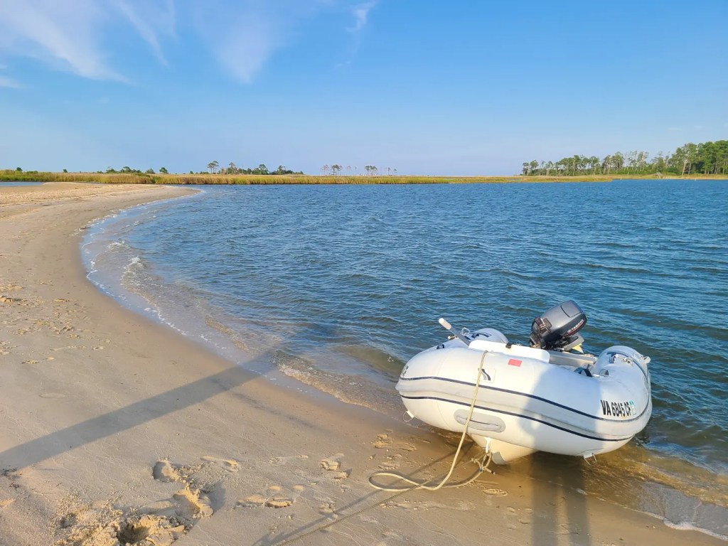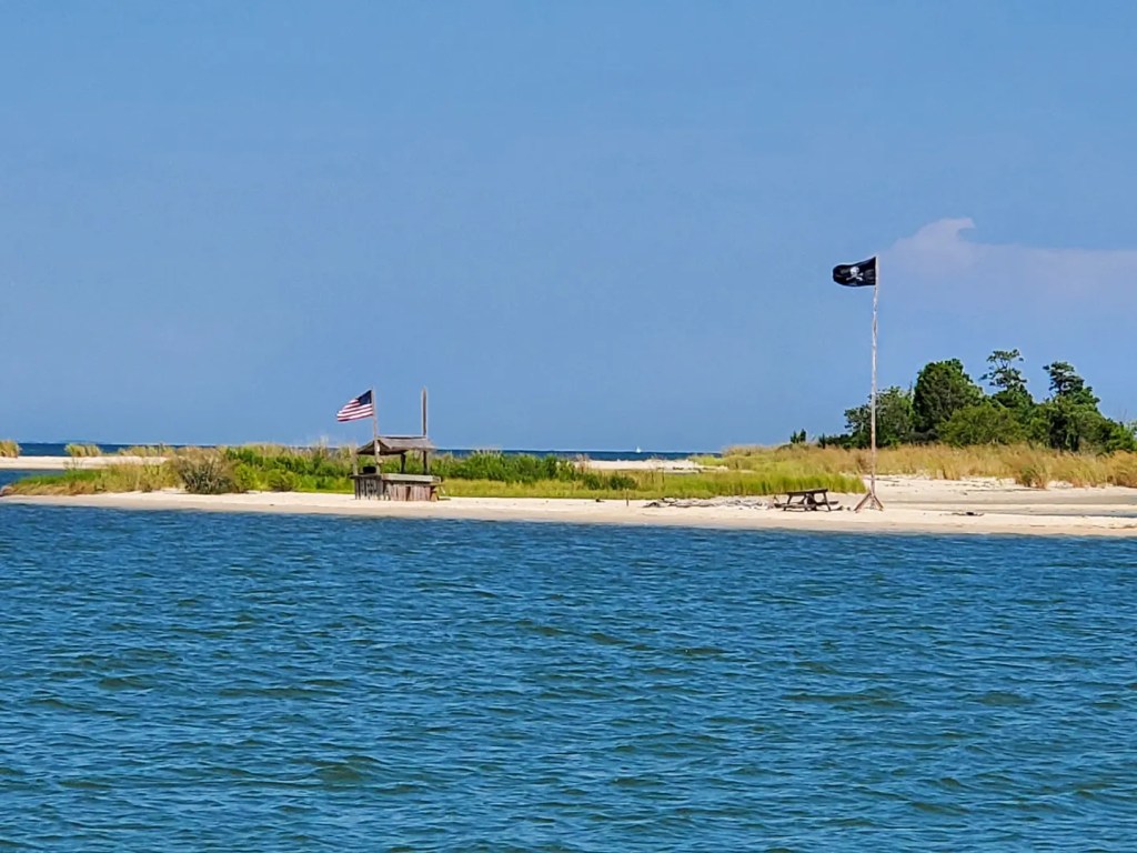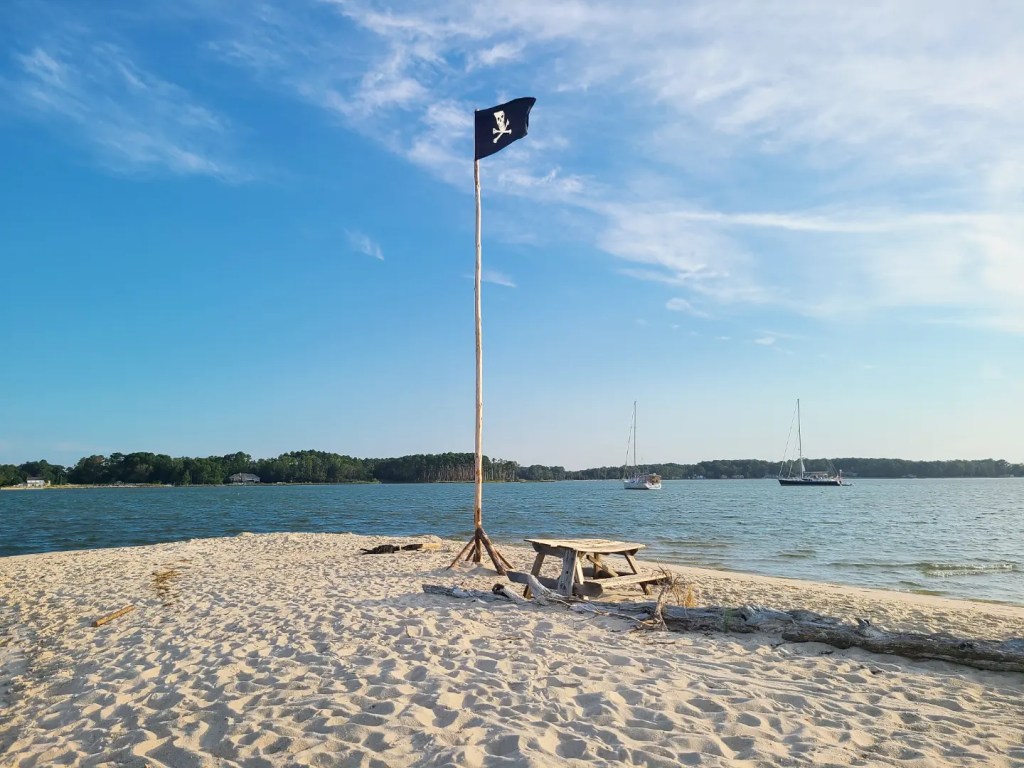 While we were a little sad to leave Urbanna behind, we knew that other new and exciting destinations were ahead of us. Just 23.1 nautical miles back out of the Rappahannock River and up and around the southeastern tip of Virginia’s Northern Neck lies Little Bay. A large anchorage with protection on three sides, marshes to kayak, and even a beach with a wooden shack and pirate flag, what’s not to love?