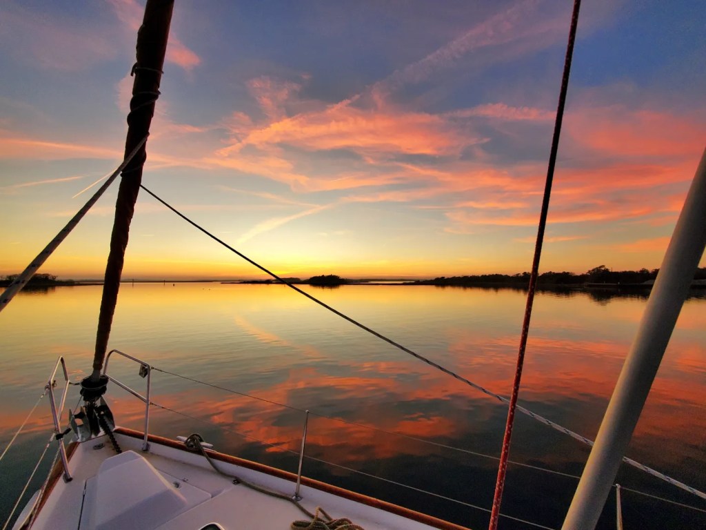 We left before sunrise from our anchorage on the Neuse River in Oriental, NC for a 9.5 hour cruise down the Atlantic Intracoastal Waterway to Mile Hammock Bay, NC, which is just outside Camp Lejeune. Dolphins greeted us as we passed Morehead City and we dropped the hook just before sunset.
