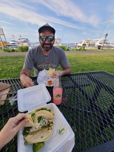 After Port Jefferson, we finally got to visit some new-to-us spots! Only 53.6 nautical miles from Port Jefferson is Sag Harbor. We’ve always wanted to come here. We were greeted in the anchorage with a sea plane taking off close to the boat (fun memories from our time in the Dry Tortugas)! Since we arrived so late in the day, we made burgers on the boat for dinner with plans to check out the downtown the next day. So worth the wait! Sag Harbor is a very cute town. Lots of beautiful old homes, shops on the main road in town, an even an old whaling museum (it was closed when we were visiting). In our usual fashion, we took a multi-mile walk around town, checking out the main commercial district, surrounding neighborhoods to get a feel for the community, and a walk to the public beach. We had no idea what we wanted for dinner, but I found a local Mexican place called Cilantro’s that we enjoyed quite a bit. We got chicken tacos, a chicken burrito, and split a Jarrito’s guava soda at a picnic table in the park on the waterfront. We loved the town, but the next day decided we had seen enough and were ready to keep moving.