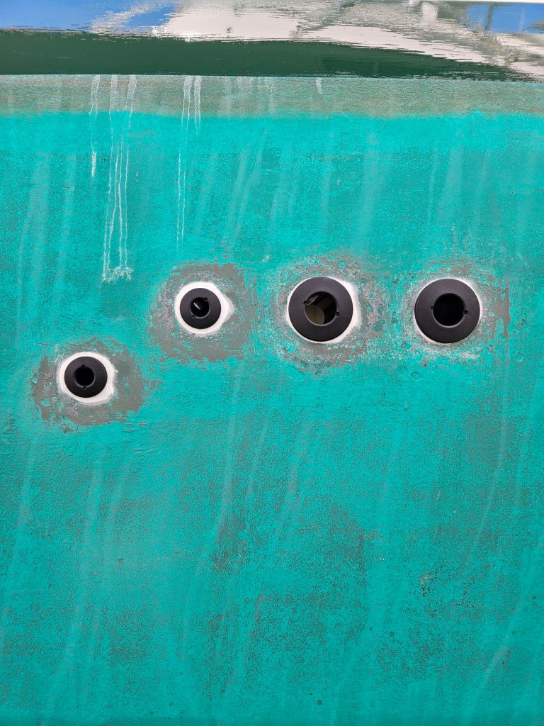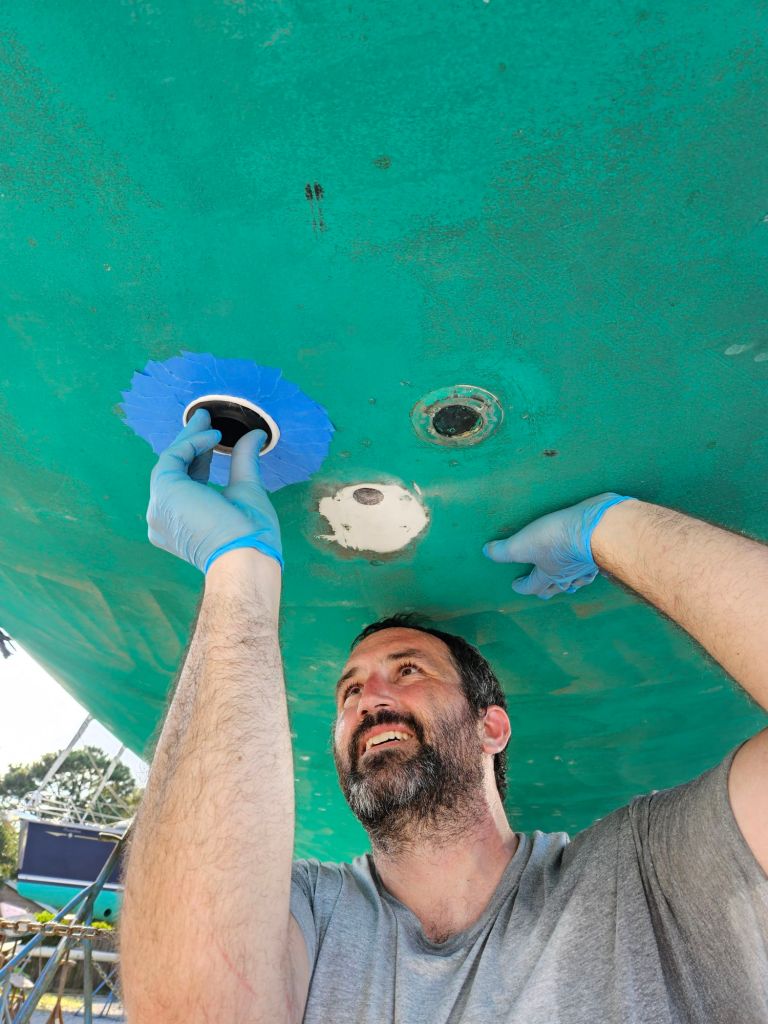 Our steps below are chronological for installing the thru-hulls as seen from the exterior of the boat. Final steps that took place on the inside, like the quarter turn of the thru-hull 24 hours after caulking and the install of the ball valves, are not reflected in this post.